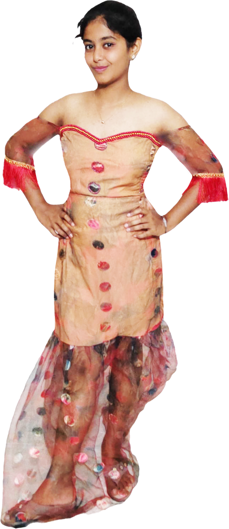 Off Shoulder Traditional Outfit With A Beige Red & Gold Beaded Top And Colorful Skirt