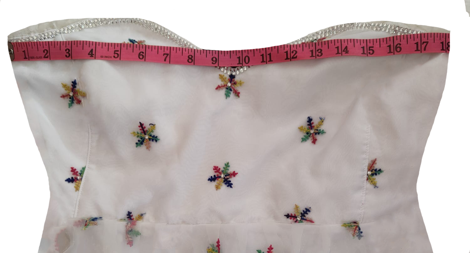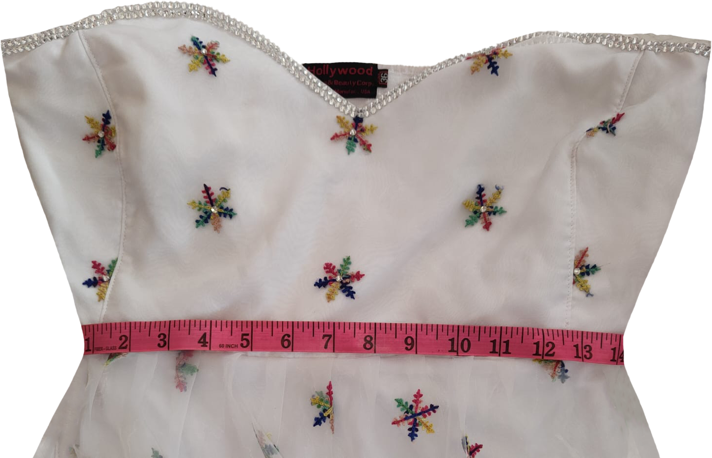 White off-shoulder dress with colorful arm sleeves white beaded floral on a white background