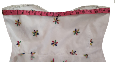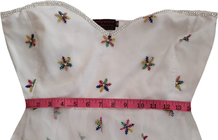 White off-shoulder dress with colorful arm sleeves white beaded floral on a white background