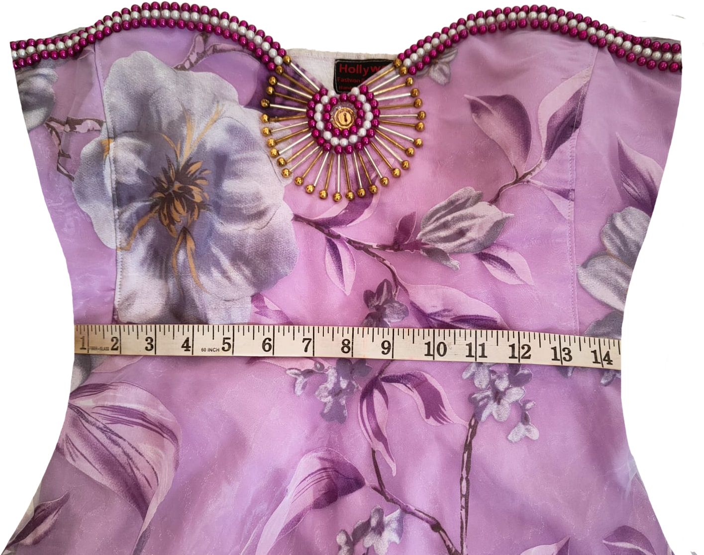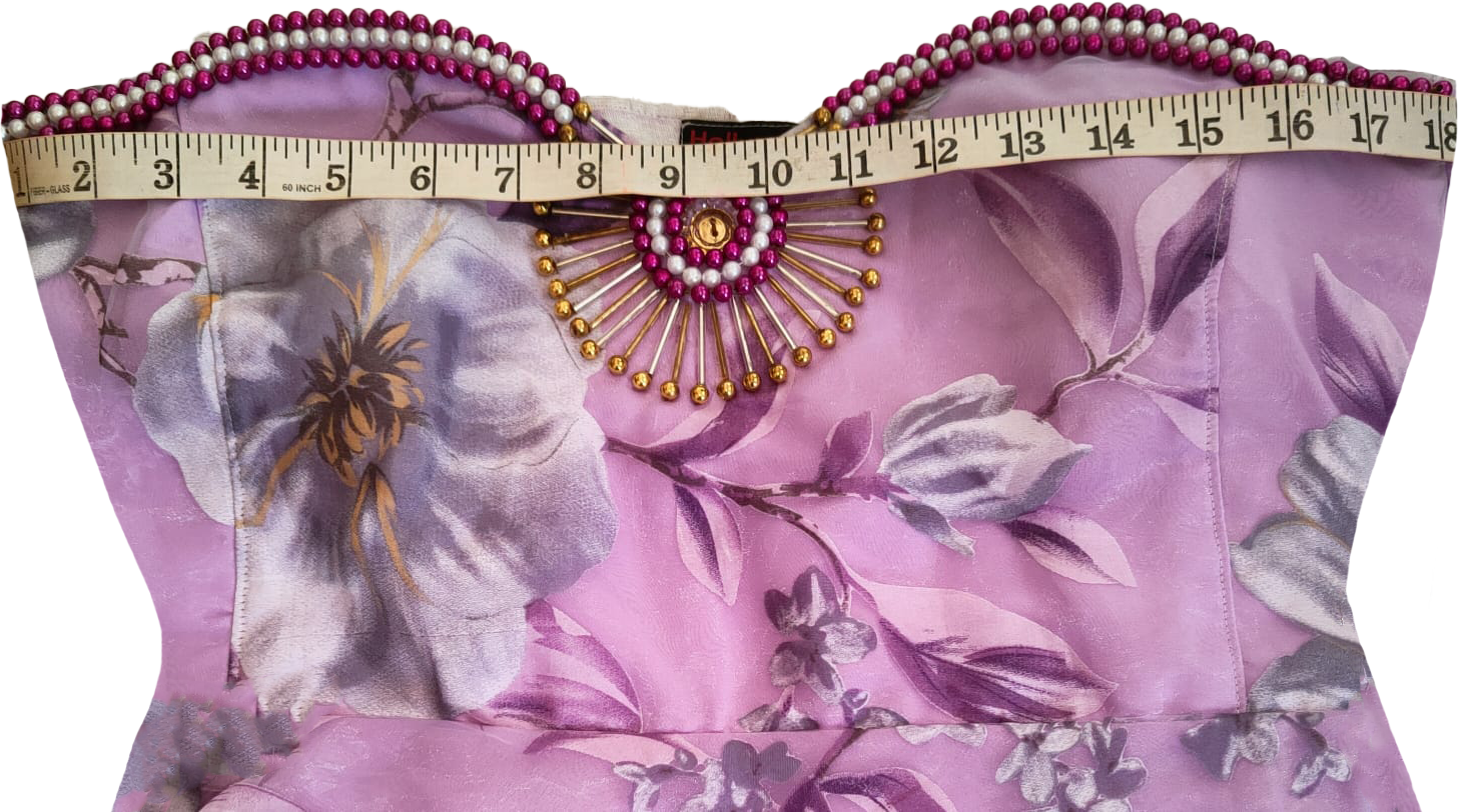 Woman wearing a strapless artistic handmade floral design beaded gown with purple accents on a white background