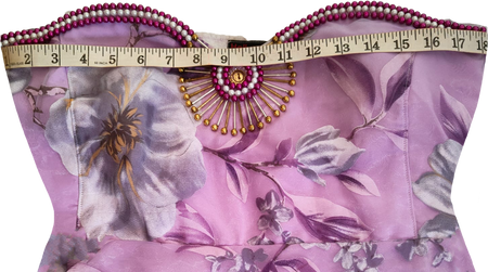 Woman wearing a strapless artistic handmade floral design beaded gown with purple accents on a white background