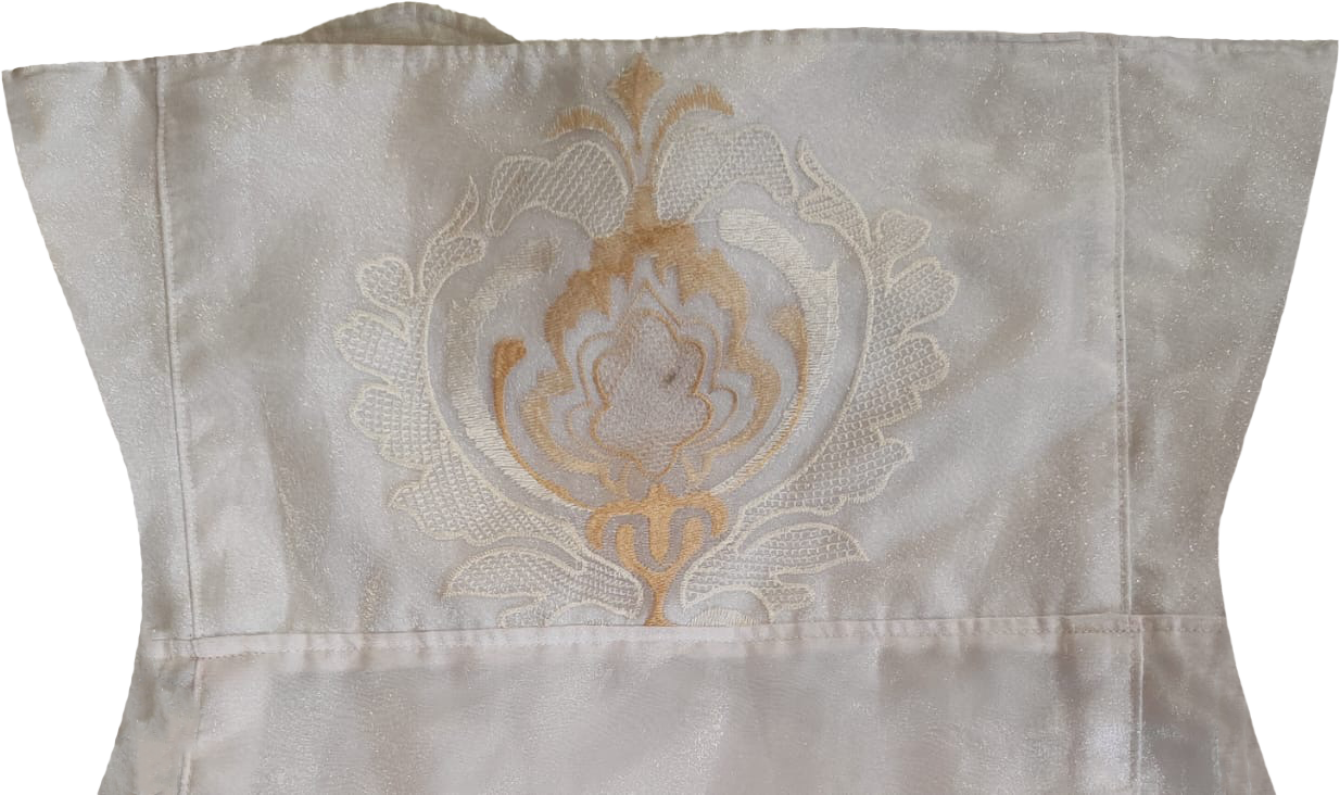 - Mid-weight, heavily embellished, non-stretchy fabric